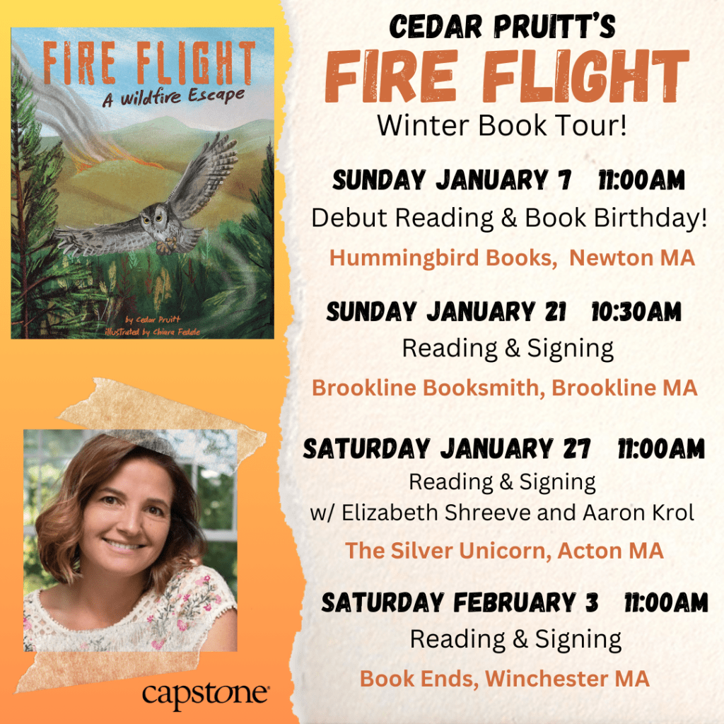 My book launch for FIRE FLIGHT: A Wildfire Escape will take place at Hummingbird Books in Newton, MA on January 7, 2024.