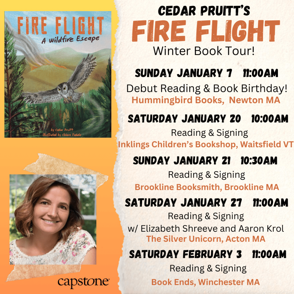 About Cedar Pruitt: Cedar Pruitt is the author of the children’s books FIRE FLIGHT: A Wildfire Escape, about an owl’s real-life surprise ride in a firefighting helicopter, and the forthcoming WHAT MARCEL FOUND: The Incredible Discovery of the Lascaux Cave Paintings, illustrated by David Litchfield and releasing in 2026. Cedar Pruitt holds an Ed.M. from Harvard University and works as a consultant in the culture and leadership of Diversity, Equity, and Inclusion. She lives outside of Boston, Massachusetts with her family.