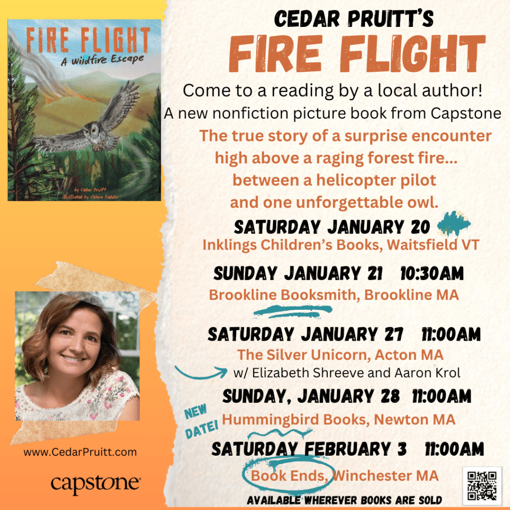 Newton, MA. Cedar Pruitt today announced the upcoming release, on 1/1/24 from leading educational publisher Capstone Publishing, of FIRE FLIGHT: A WILDFIRE ESCAPE, her debut nonfiction picture book for children ages 5-9. It tells a true story ripped from the headlines: an owl that flew out of a wildfire and into the co-pilot seat of a firefighting helicopter, where it stayed for several water drops. The pilot snapped an incredible photo, which is included in the book.